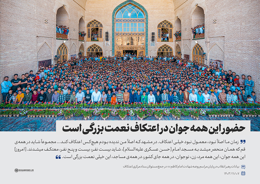 حضرت آیت‌الله خامنه‌ای رهبر انقلاب اسلامی روز یکشنبه ۷ بهمن‌ماه ۱۴۰۳، در پایان مجلس روضه‌ی شهادت امام کاظم علیه‌السلام که با حضور مسئولان ستاد مرکزی اعتکاف برگزار شد، بر اهمیت تثبیت حالات معنوی اعتکاف در جوانان تأکید کردند.
