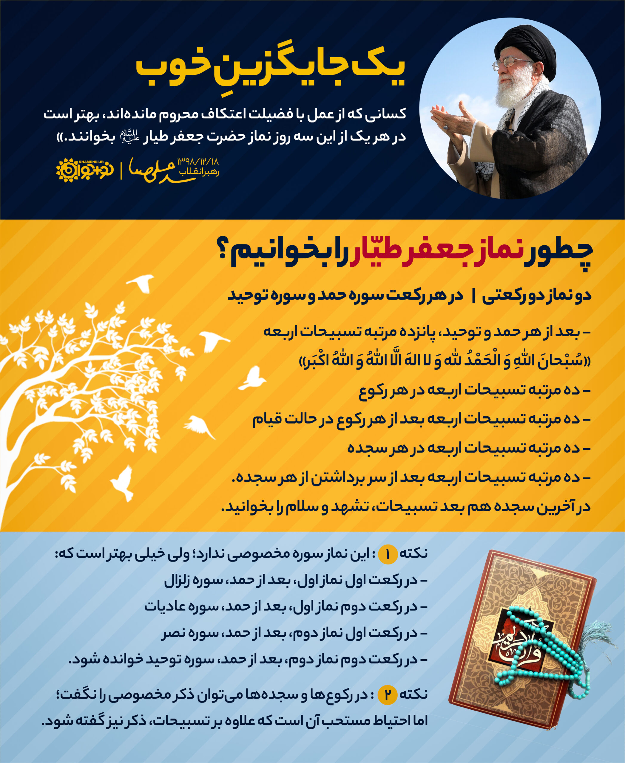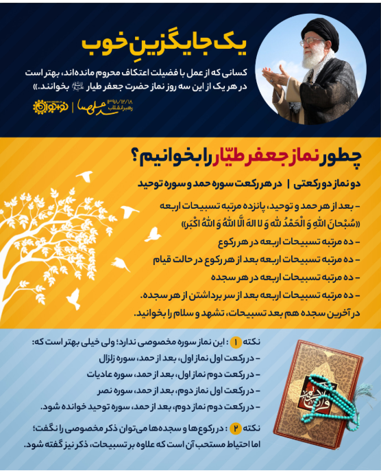 کسانی که از عمل بافضیلت اعتکاف محروم ماندهاند، بهتر است در هر یک از این سه روز نماز حضرت جعفر طیار علیهالسلام بخوانند.